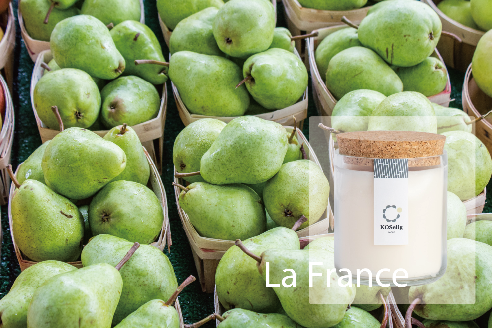 ラ・フランスはフルーツ特有の爽やかさがありながら、落ち着きを与えてくれるような柔らかさがある香りです。ほんのりとした柔らかさが暖かいムードを提供してくれます。